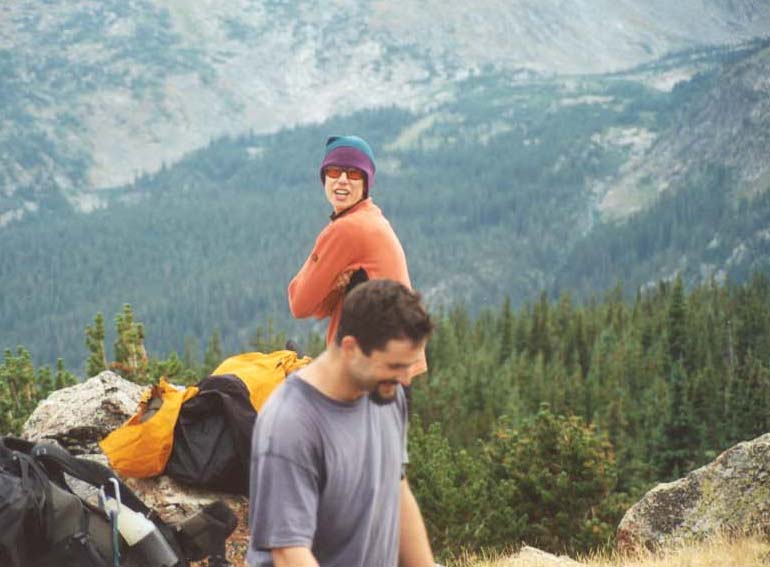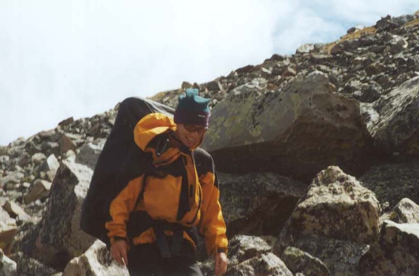 Tricia crossing the boulderfield on the north side of Comanche.
