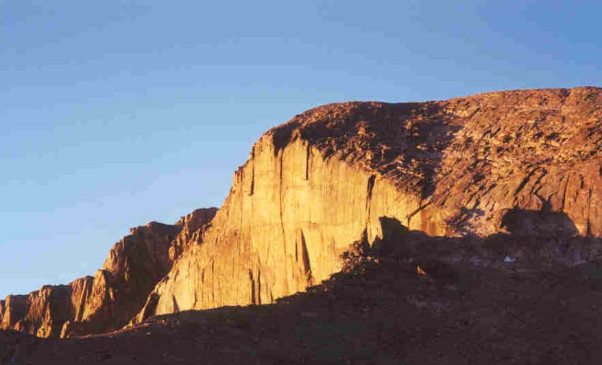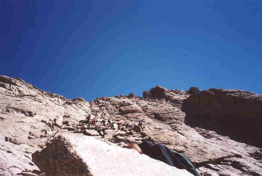 From the top of the rock I had climbed I could see all the members of the Team and that everyone was doing well. There was no way to get lost in this section since all that was required was to follow the person in front of you so I continued climbing the more technical rock that formed the right side of the Trough. I eventually ended up in the next gully south and followed that to the top of the Trough. I then traversed over to the very top of the Trough and waited for the team to catch up. The top of the Trough is blocked by a 15 foot boulder that must be climbed. When some of our team arrived, I climbed down to them and climbed up directly behind them to assure them that they were not going to fall. It was perhaps the hardest technical section of the ascent.