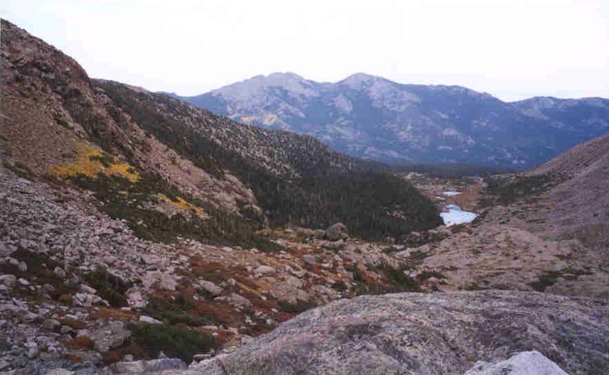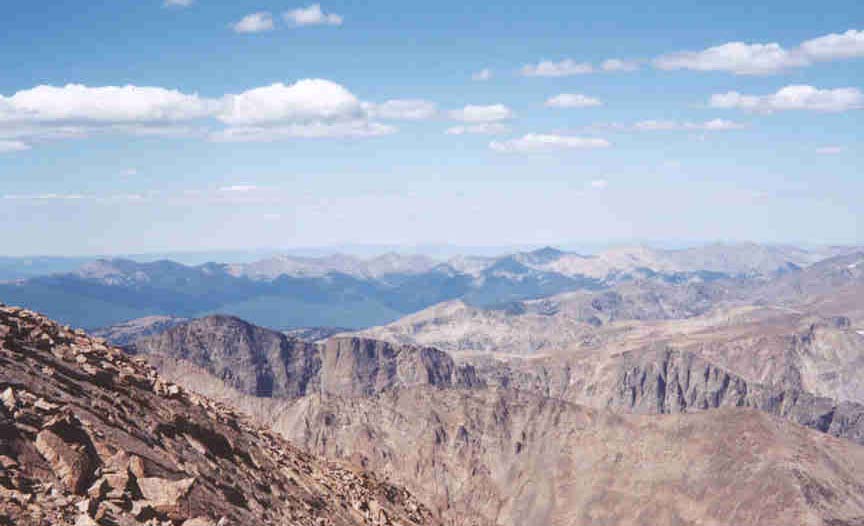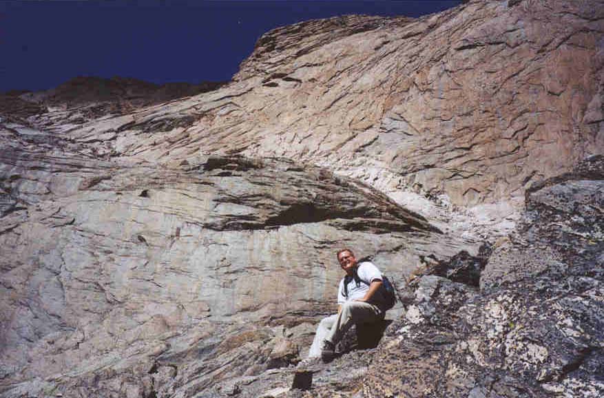 The entire team regrouped again in the Boulderfield to rehydrate. We took a short break and then began to make our way up to the Keyhole. (an obvious weakness in the ridge that blocks access to the west side of Long's) We were all feeling the altitude by this point and stopped in the Keyhole to eat some breakfast. The view from the Keyhole was fantastic. The ground dropped away for 2000 feet into Glacier Gorge revealing some of the Park's best known landmarks. (The Spearhead, ChiefsHead, Mc Henry's, Arrowhead, Black/Blue/Green/Frozen/Shelf lakes) On the horizon, we could see west to the Never Summer mountains and south to the Gore Range and some other ranges that are fifty miles away.