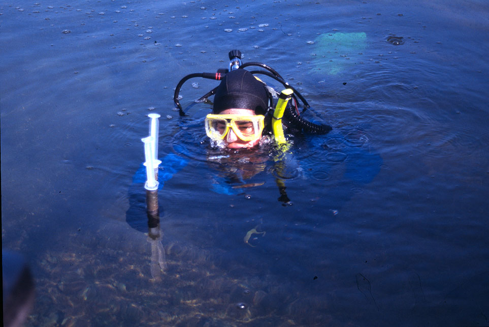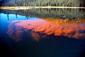 A plume of rohdamine in Bull Trout Lake. We used rohdamine to track water flows in the streams and lakes. Rohdamine is ecologically safe. |