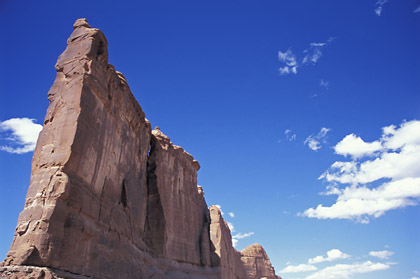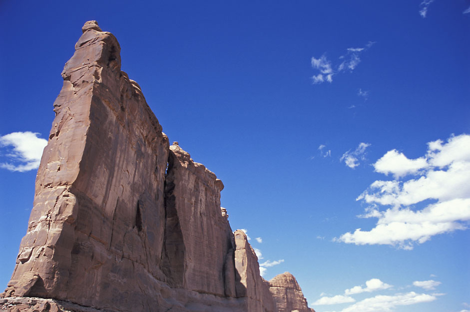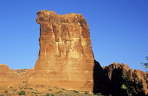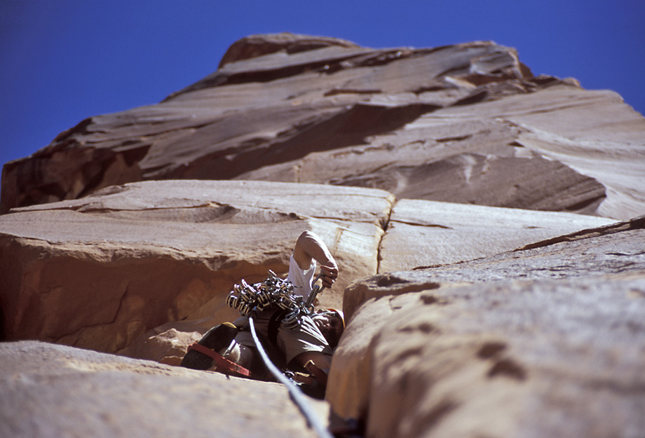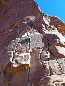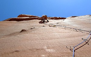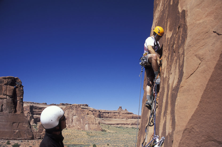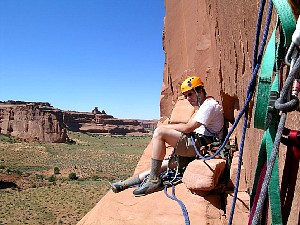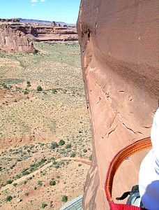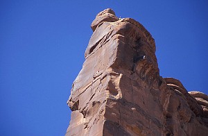 Eventually, we decided that Zenyatta Entrada at 5.6, C3 seemed marginally attainable. None of us had ever climbed in Arches but we figured the stories about the soft Entrada sandstone were exaggerated and that it would be no worse than the Fishers. After spending the first day at the River Road Dihedrals in intermittent rain, I had almost cajoled Ian into having a go at the Tower with us. After all, he had just gone up and finished the crux of a route that had kicked my arse.