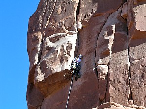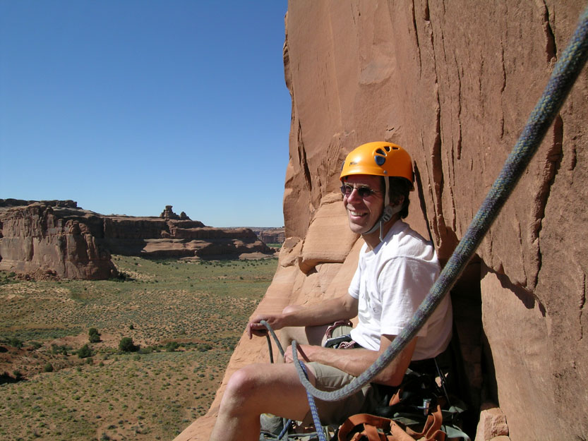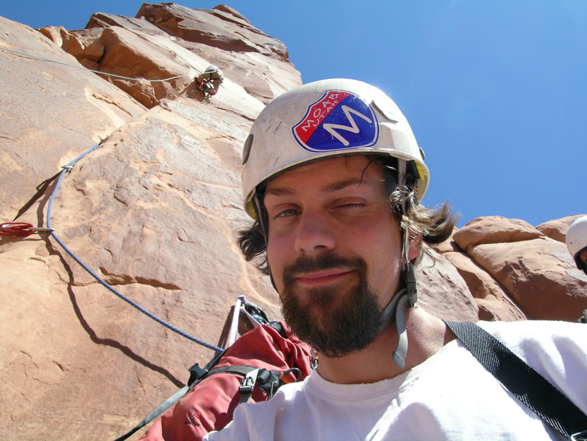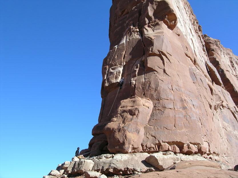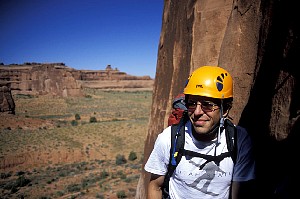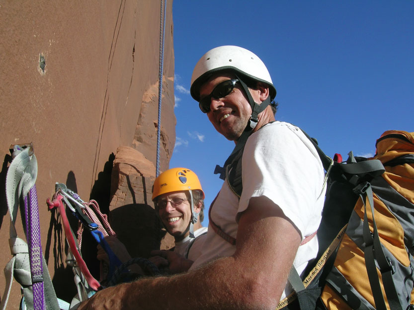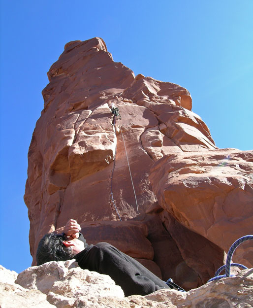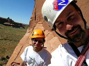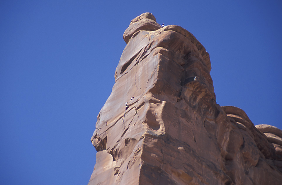 Then it was over and Ian was standing above the final difficulties. He fixed the line and continued unroped to the summit. Pavel and I followed and we all shared a fleeting moment on the summit in the warmth of success, camaraderie and the Moab sun. I was elated. This dream had been with me for years and I had finally achieved it with the help of two of my best friends. For now, my inner demons were sated. All we had to do was get down safely, find the girls, and tell them that we loved them and that were sorry for having inconvenienced them so selfishly.