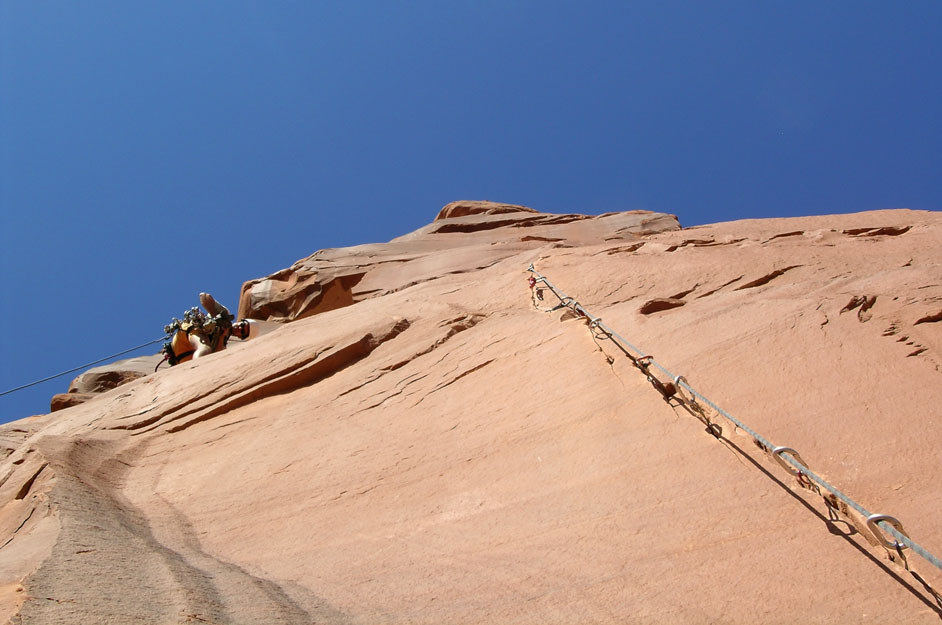 Committing to a tri-cam in a very boxed out pin scar I eased up off the bolt. The placement was really marginal but I had a bolt just below so I felt reasonably safe. I remembered a fall in Zion from a similar placement and quickly tried to put that our of my head. Next up was a big alien in a pin box. This placement was also dismal and was making grating noises as I stood on it, trying to grind out of the scar. Oddly, it felt good to get on the next skyhook placement. At least it didn't feel like a time-bomb. I stood there trying to see the sequence that would see me through the last of the difficulties. I was at a loss and starting to worry when I found an incut bathole and stood on my first bathook. This didn't feel as good as the skyhook but it still felt fairly solid. I looked up at the next hook placement and then down. The tri-cam had fallen out. Deeming the possibility of down aiding unappealing I concentrated on finishing. One more skyhook placement and I could see the anchors 8 feet away. Having run out of positive hook placements, I put all the hooks on the bottom of one aider and started gently whipping it up at the anchor slings. 14 tries later, I actually slotted the biner the hooks were attached to around a large protruding angle piton and hauled myself up to grab the anchor with great relief.