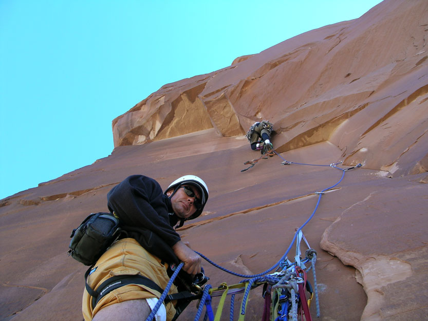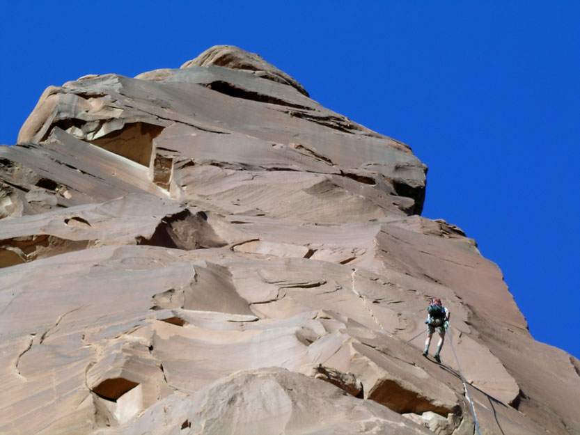 Ian took off next on the "C1" second pitch. Poor Ian. He keeps getting sandbagged in the desert. His first tower was the Titan. Then we climbed Dolomite Spire for his second aid route and I hurt my ankle forcing him to lead most of the route, and now he was stuffing black aliens into some of the softest rock any of us had ever climbed. None-the-less, he was managing famously until a black alien he was standing on shifted and little pebbles started to rain out of the crack from around the placement. After that he was just a blur of motion slamming shady placements into the crack trying to avert a fall. It was a tense moment for all of us. I tried to will him to success from the belay, not wanting to see my friend hurt his ankles on the lower angle rock below. Again I debated the wisdom of pushing someone to climb in the desert who isn't wholly committed on their own. When he finally finished the pitch, I asked how he was doing. He yelled in an audibly shaken but purposefully comedic voice... "I DON'T KNOW.... I CAN'T THINK!" I mentioned to Pavel that he was really going to love that lead in three weeks and we shared a somewhat uneasy smile as we prepared to jug.