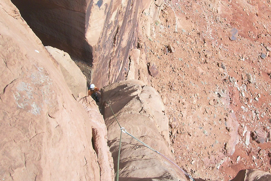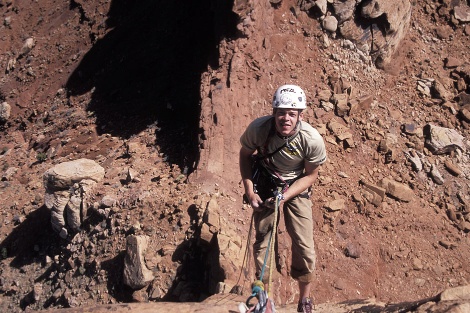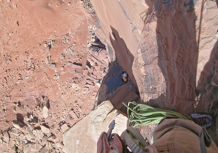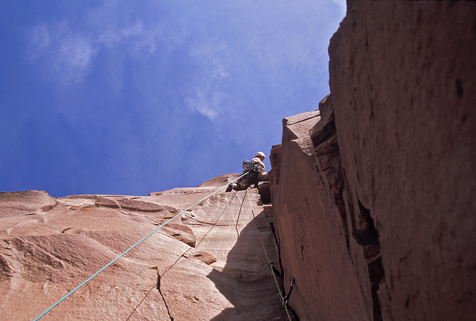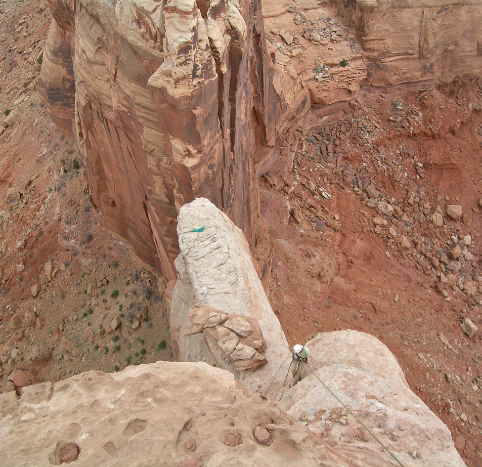 Looking down at Ben as he rappels from just below the summit back to The Plank. |