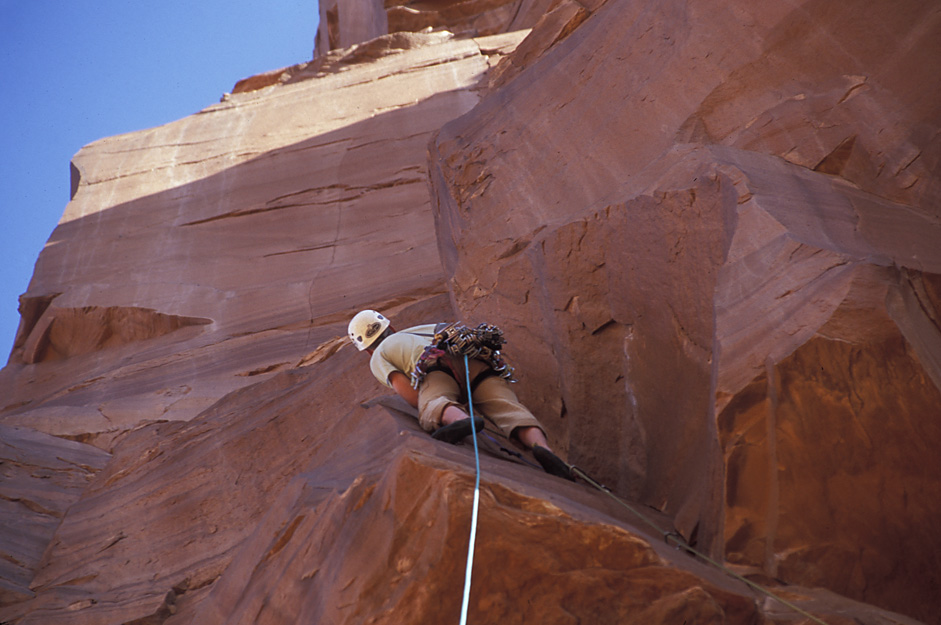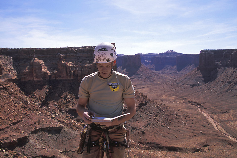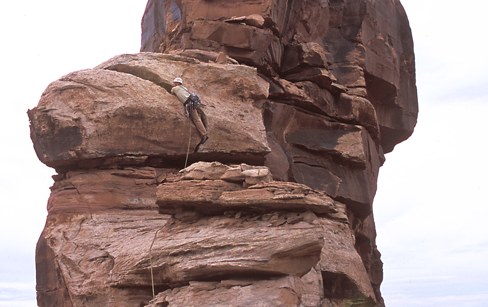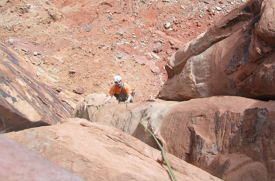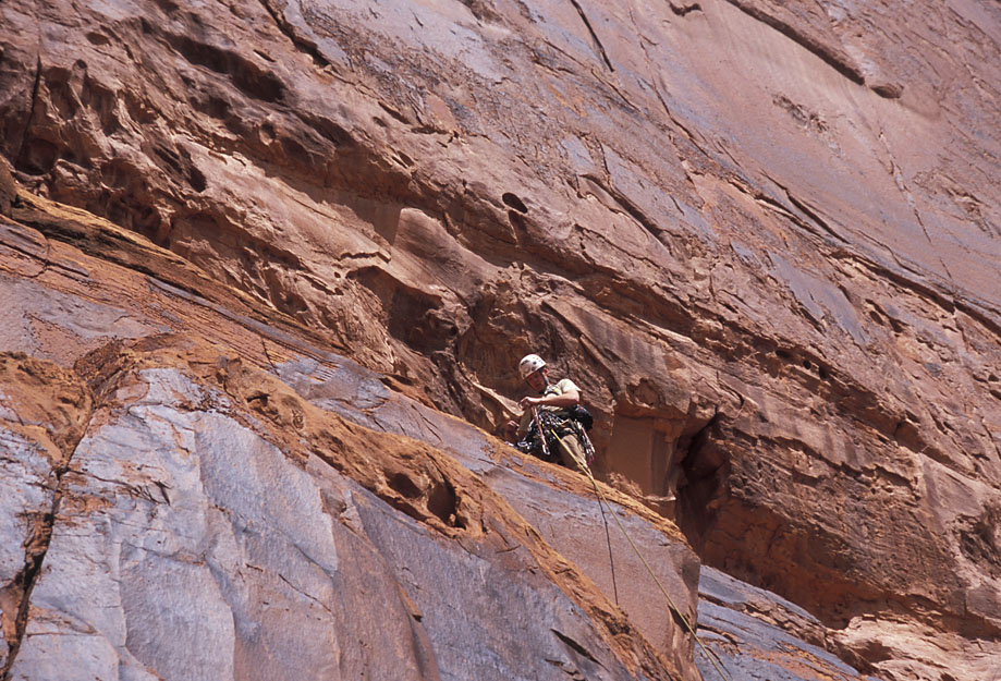Looking down at Ben as he rappels from just below the summit back to The Plank. |
